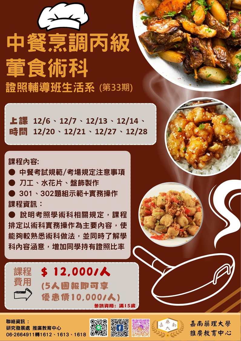 課程名稱:中餐烹調丙級葷食術科證照輔導班-生活系第33期